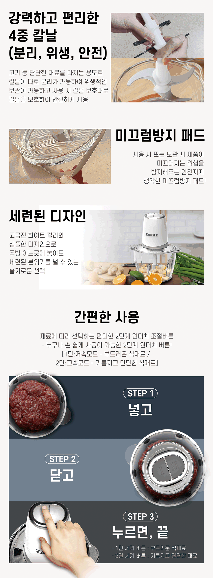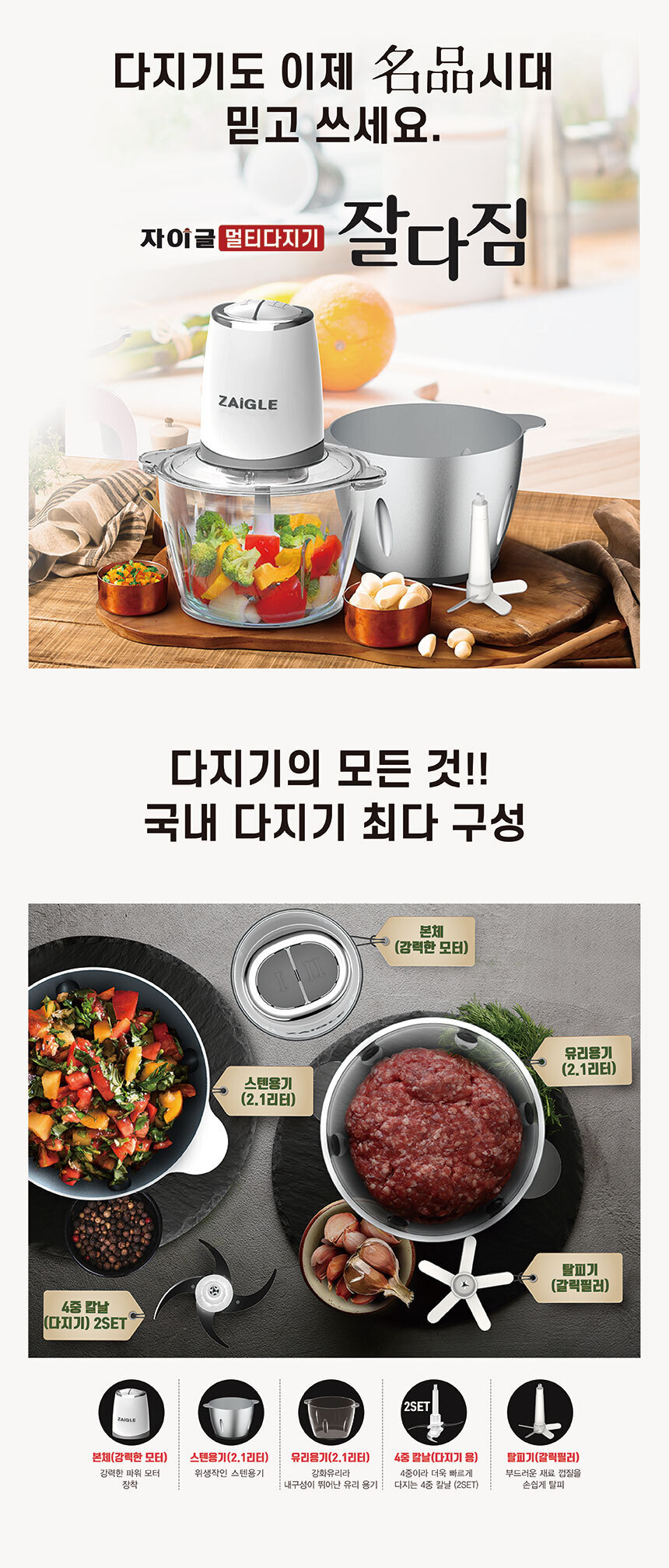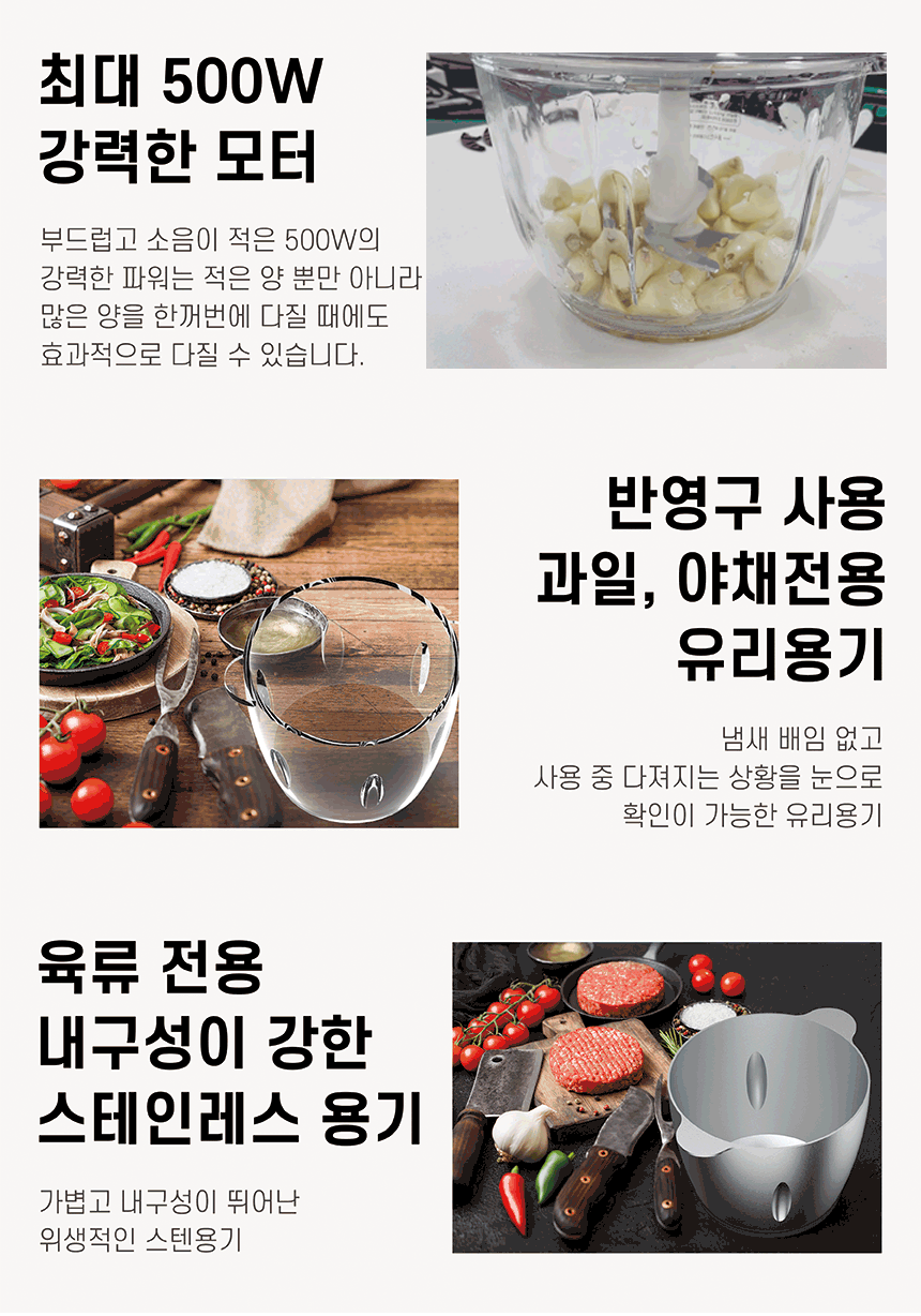본체,뚜껑,유리용기,스텐용기,다지기칼날2개,탈피기날,미끄럼방지패드,사용설명서,간편사용설명서,이중박스포장