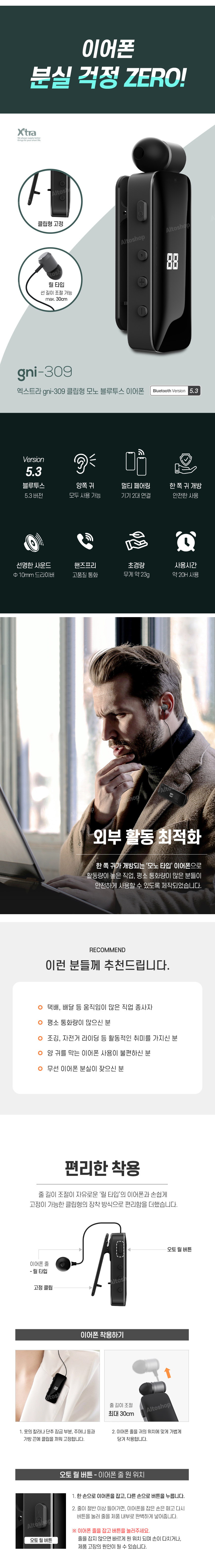- 클립형 장착방식으로 옷깃, 가방 어깨끈 등에 착용 : 목에 무리가 가지않음