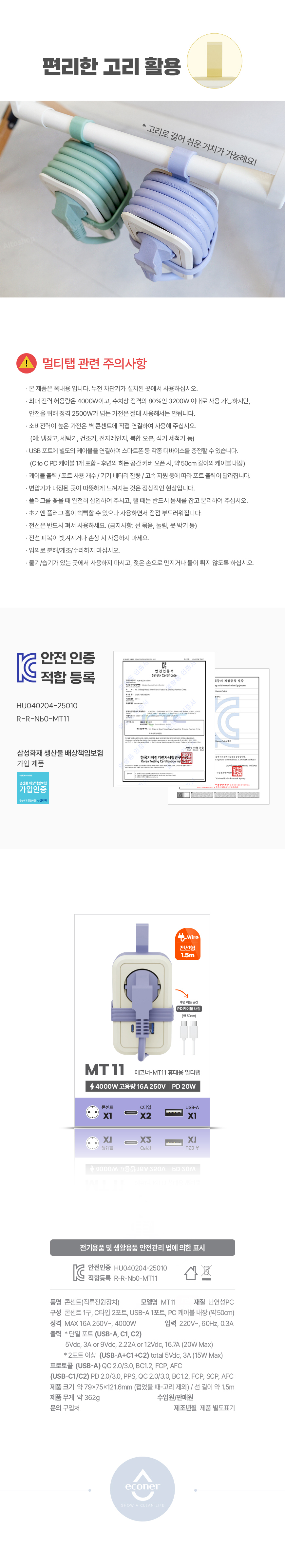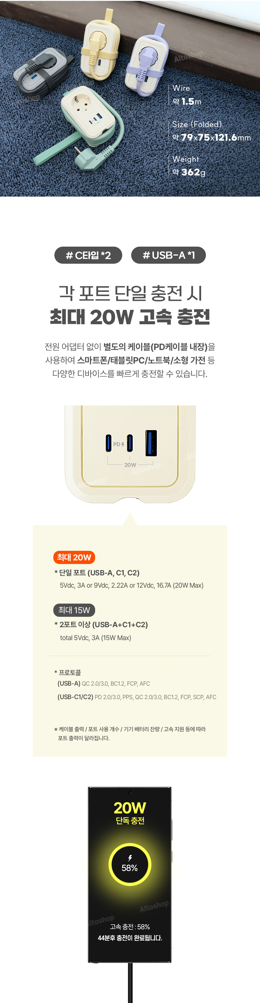 제품 크기 : 약 79 x75 x121.6 mm, 전선: 1.5m / 재질 : 난연성PC / 무게 : 약 362g