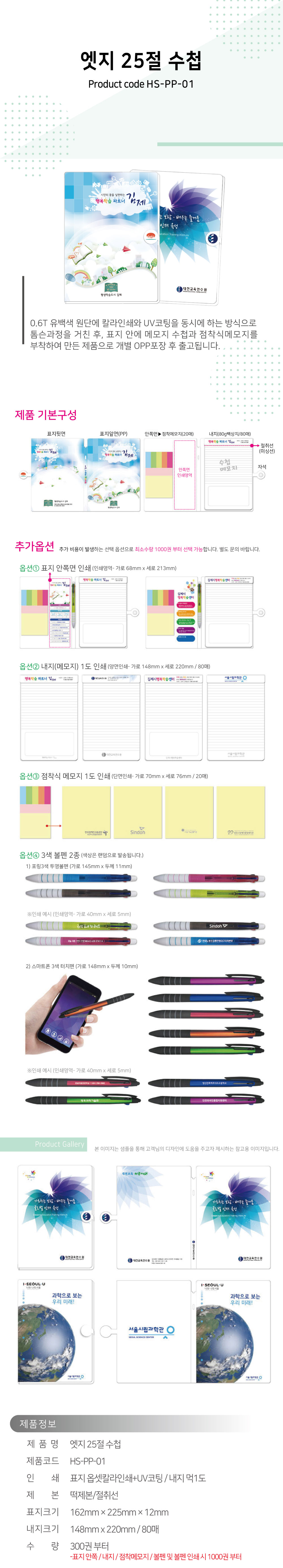 0.6t 유백색원단 컬러인쇄 UV코팅 +우측 내지 80매 +점착메모지 각 20매+opp