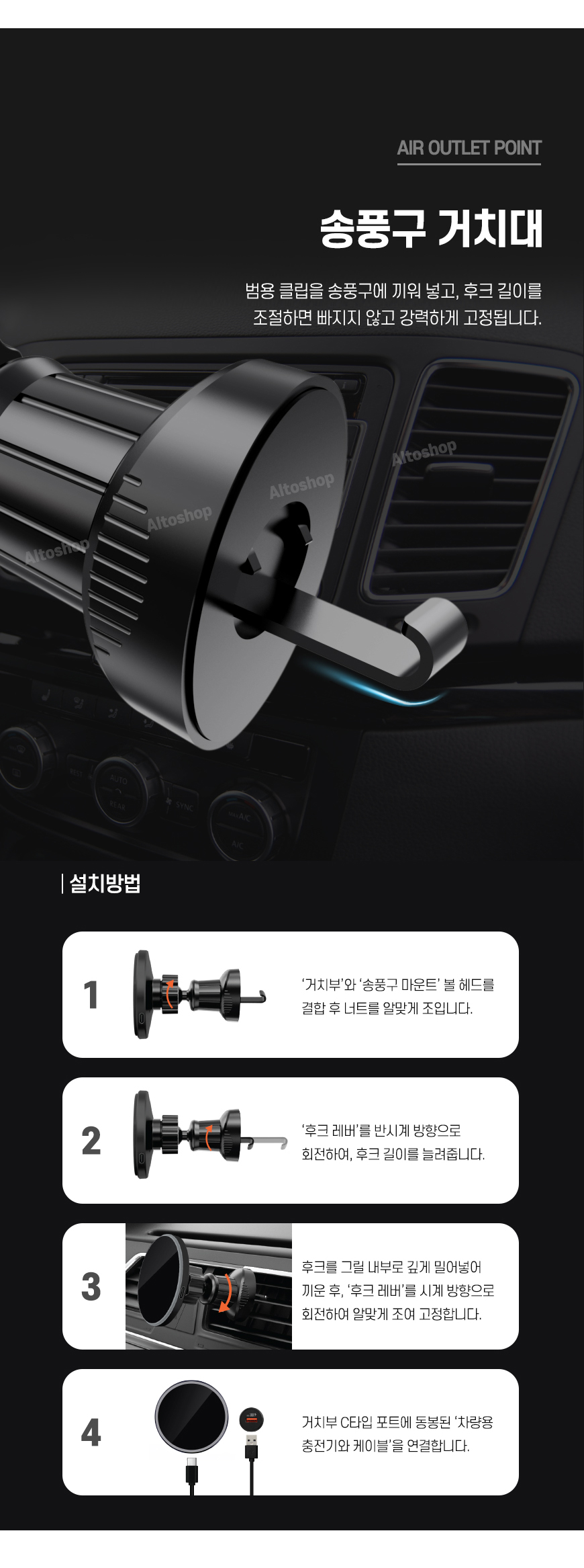 거치부, 송풍구마운트, 메탈링스티커, 차량충전기,C타입USB케이블, 설명서
