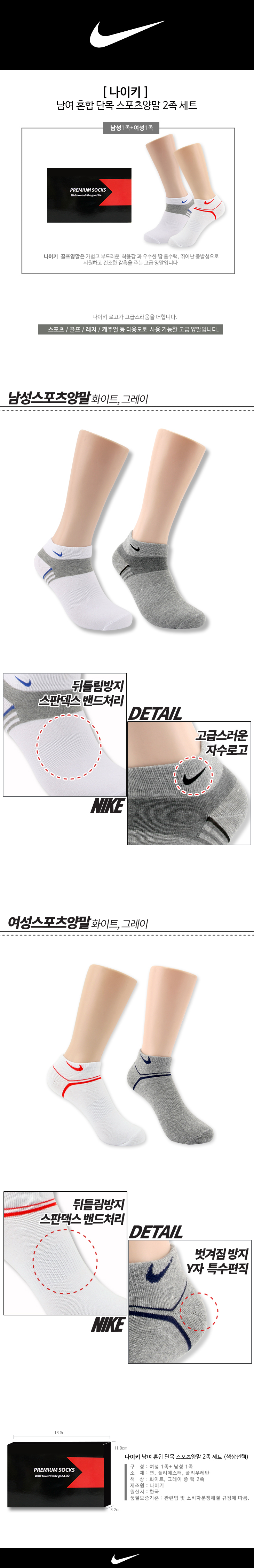 남녀혼합 단목 스포츠양말 2족 / 화이트, 그레이