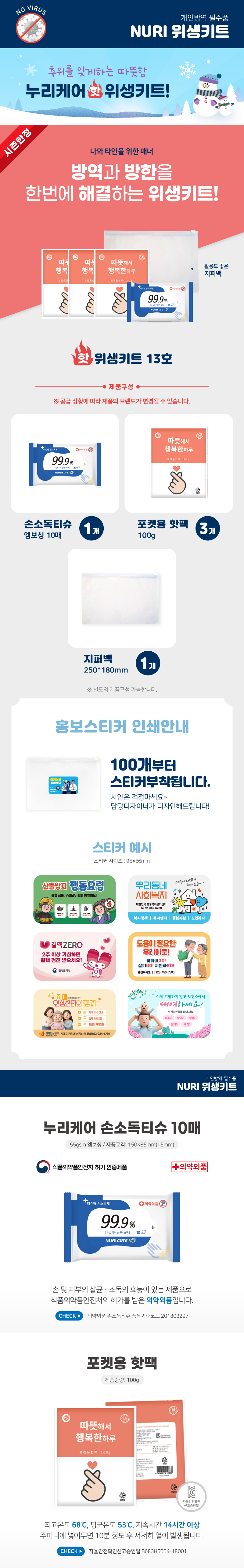 핫팩3개+손소독티슈10매(엠보싱)1개