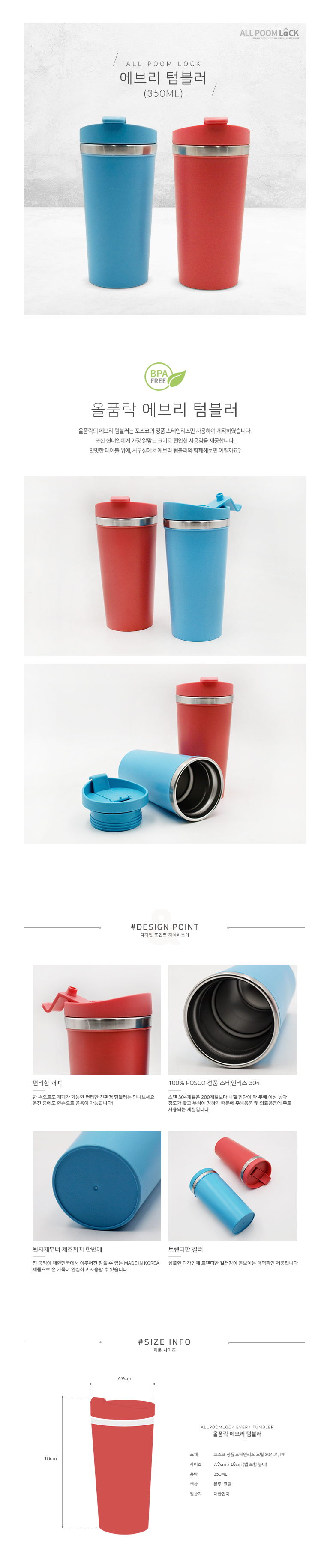 63*140mm, 350ml (하단지름*높이, 용량) / 텀블러 내피 - 스테인리스 / 텀블러 외피, 뚜껑 - PP
