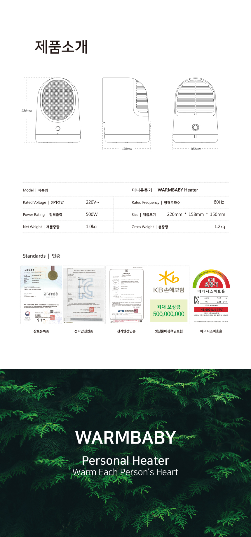 정격전압 : 220V - 60Hz / 소비전력 : 500W / 에너지소비효율등급 : 48,000원/월(가정) / 중량 : 1000g / 냉난방면적 : 8평