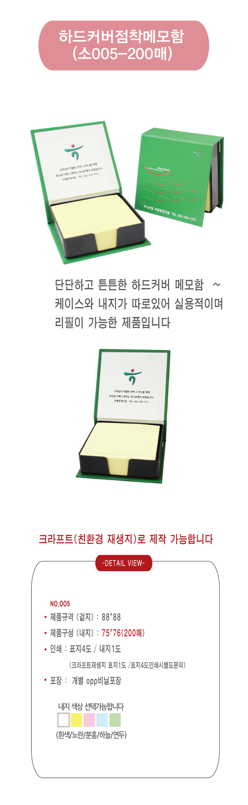 겉지:88*88 , 내지: 70*76(200매) 내지색상: 흰색/노란/파란/연두/분홍