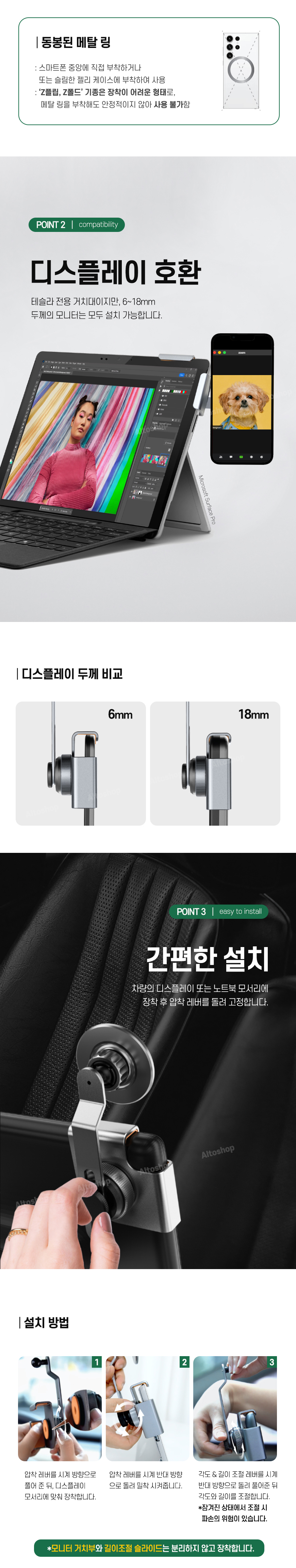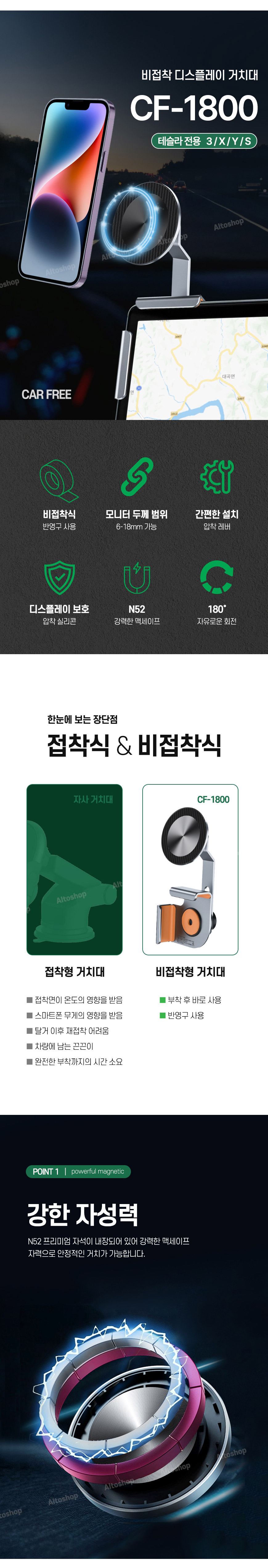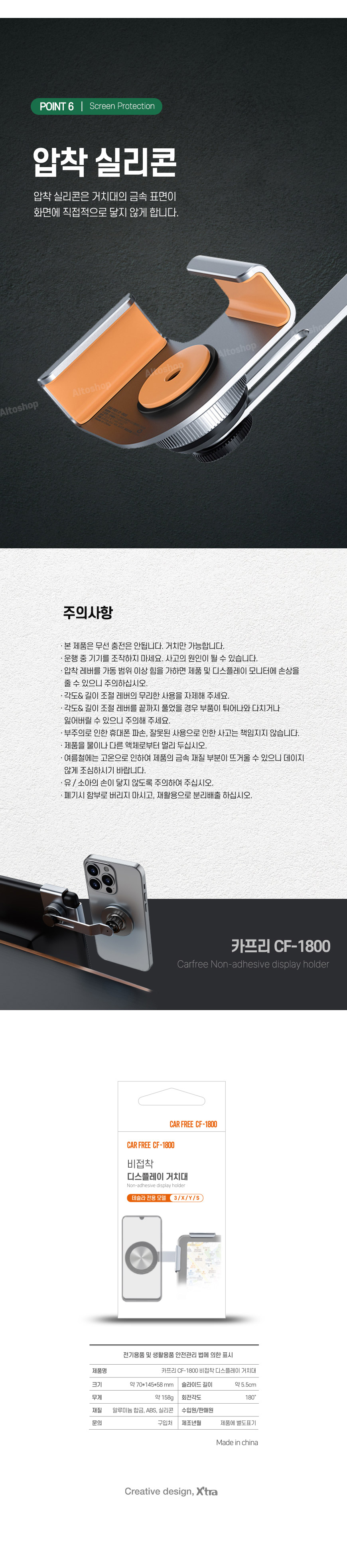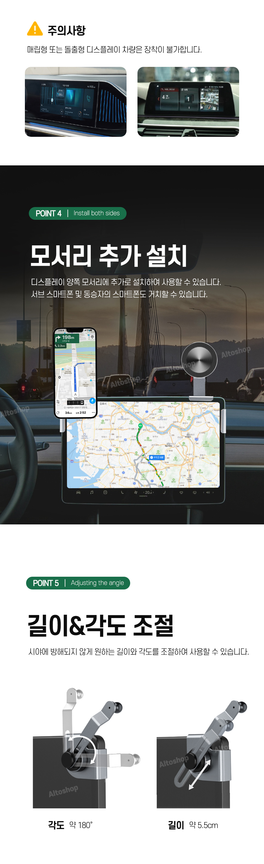 - 180도의 자유로운 회전, 55mm 슬라이딩 조절로 내차의 디스플레이를 가리지 않습니다
