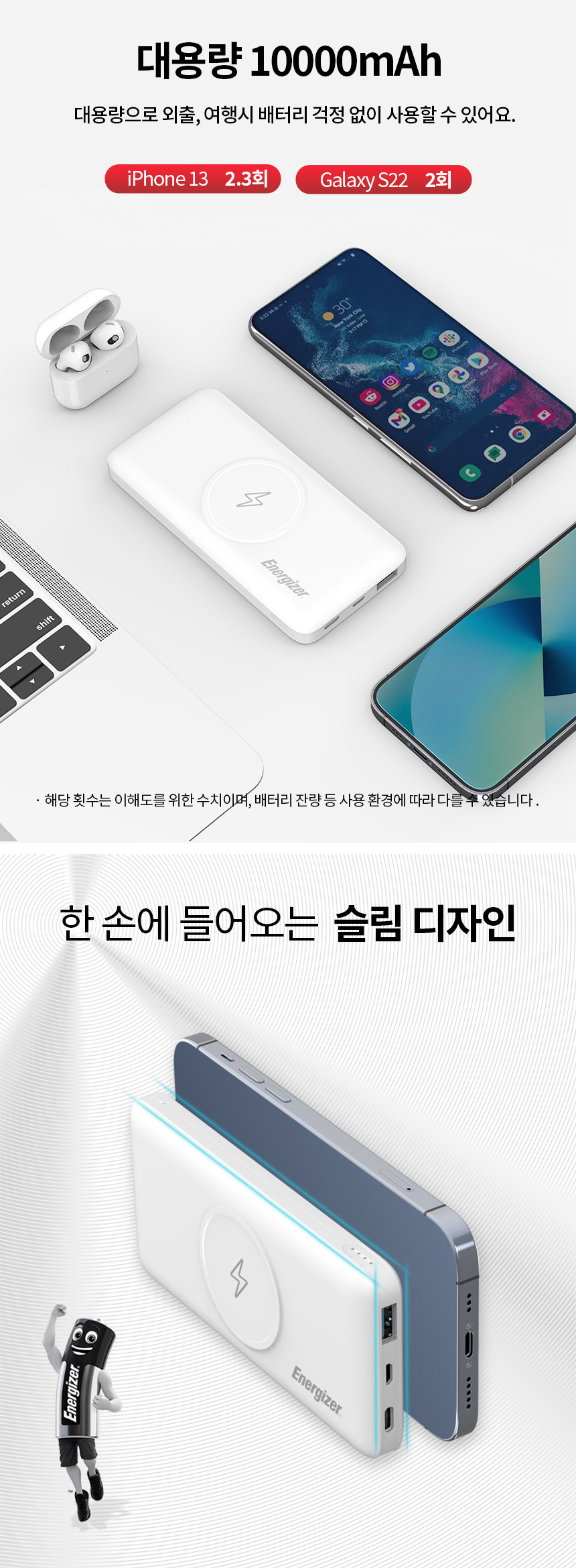 용량 5,000mAh 무선출력 15W 입력 USB-C 5V/2.4A 유선출력 USB-C 5V/3A (MAX 15W)