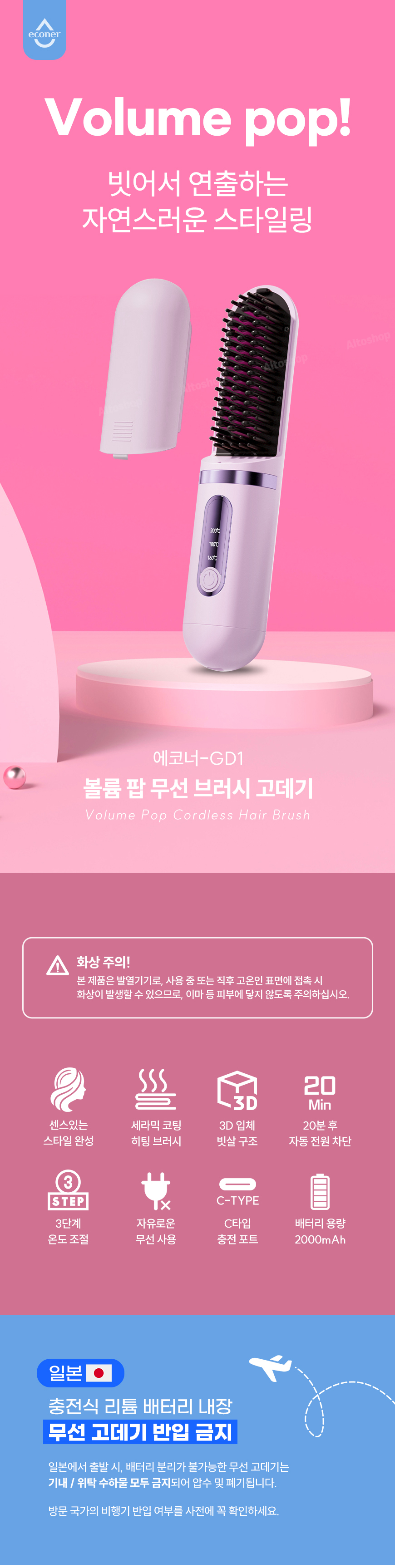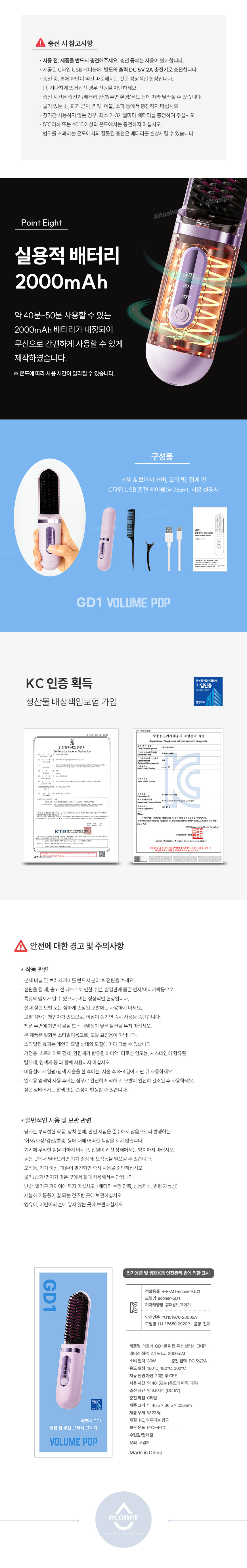 브러시본체,브러시커버,꼬리빗,집게핀,C타입충전케이블,설명서