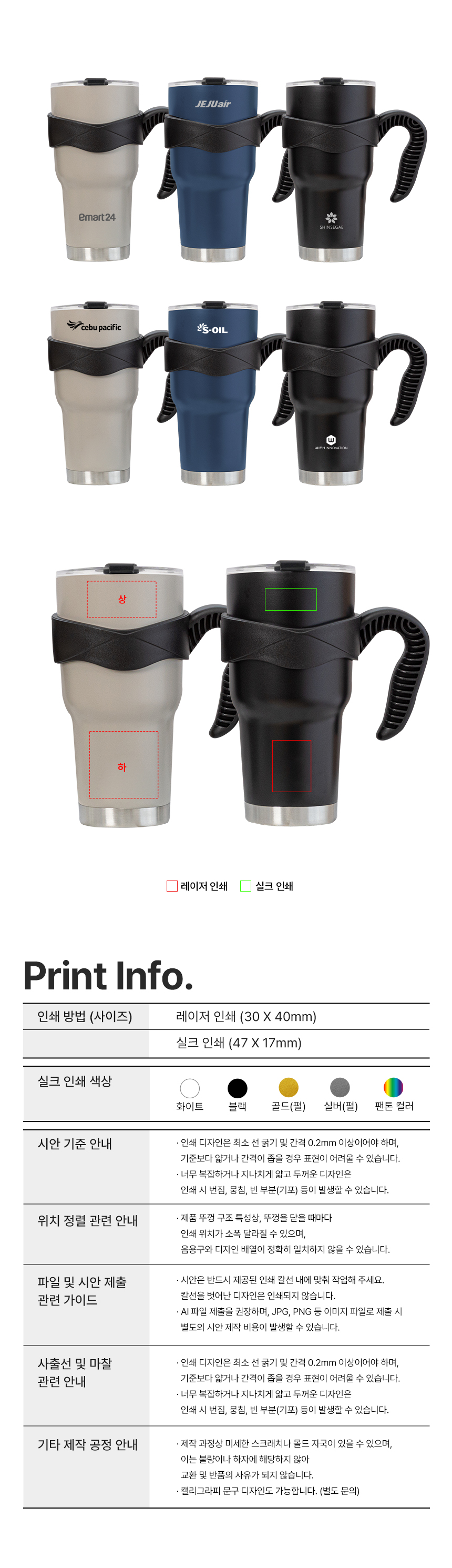 실크인쇄 / 컬러인쇄 / 레이저인쇄 / 박인쇄 / 자수인쇄 / 에폭시인쇄