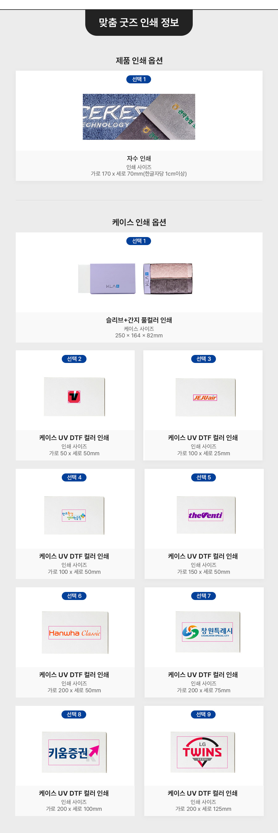 실크인쇄 / 컬러인쇄 / 레이저인쇄 / 박인쇄 / 자수인쇄 / 에폭시인쇄
