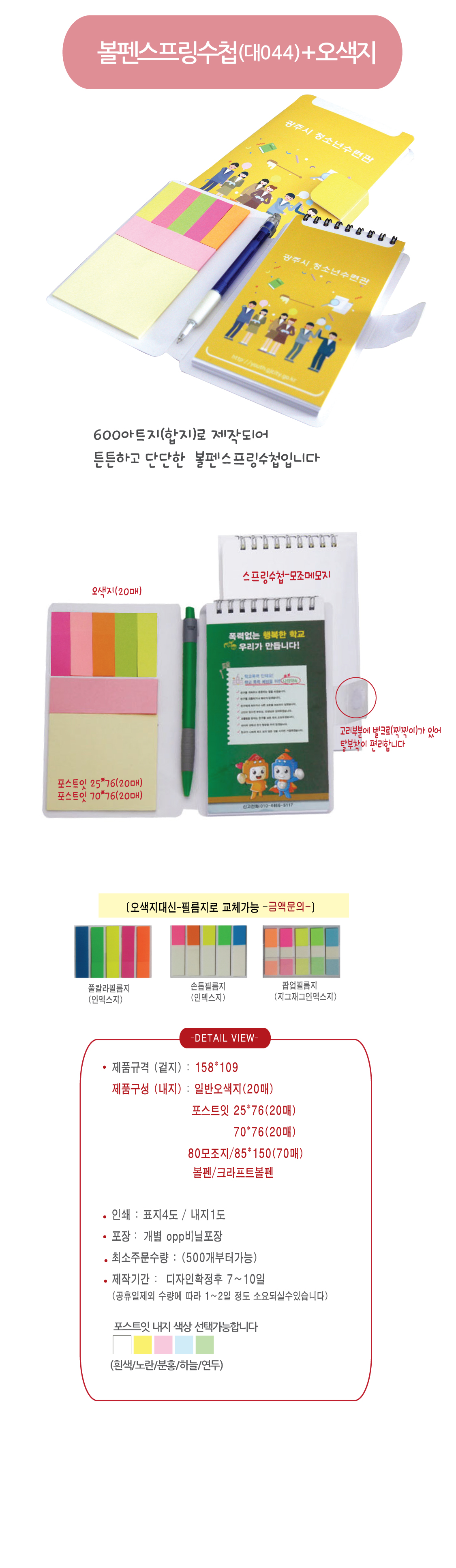 오색지+포스트잇(2종)볼펜+수첩메모지 / 포스트잇내지색상: 흰색/노란/파란/연두/분홍